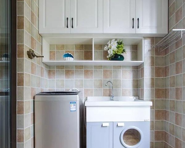 現(xiàn)在大部分家庭里面的陽臺(tái)都是這樣的布局,洗衣機(jī)、洗手臺(tái)和吊柜,頂部做升降式的晾衣桿,吊柜和洗手臺(tái)之間還有一些置物架、掛桿等。