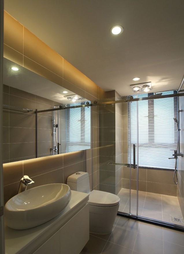 衛(wèi)生間的裝飾比較簡單,利用小塊地磚作出坡度,鋪貼在地面上。臺(tái)上式的洗漱臺(tái)設(shè)計(jì),與白色的浴柜設(shè)計(jì),在筒燈的照射下,顯得格外干凈。